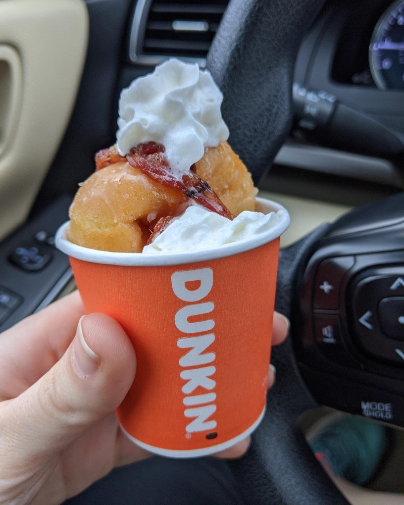 - “Asked if I could buy one single munchkin for my dog’s birthday and they blessed her with all this. Glazed munchkins, bacon, and whipped cream!”