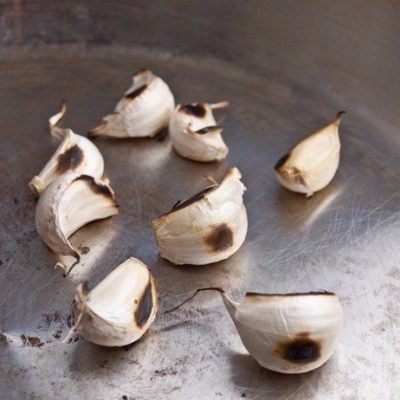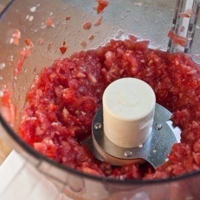 Fry the unpeeled garlic cloves in a frying pan without oil until they become soft and blackened in some places (for approximately 10–15 minutes). Then remove the pan from the heat and let the garlic cool. When the garlic has cooled, peel it and put it in a food processor with peeled tomatoes cut into medium-sized pieces. Process until mashed. |