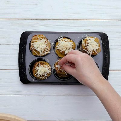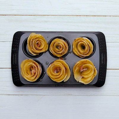 The finished "flowers" are easy to remove from the pan, and melted cheese prevents them from crumbling. It’s not necessary to make small servings. You can also cook one huge potato flower in a bakeware, and serve the meal right in it!