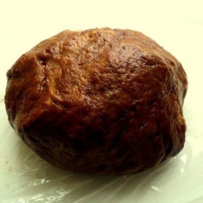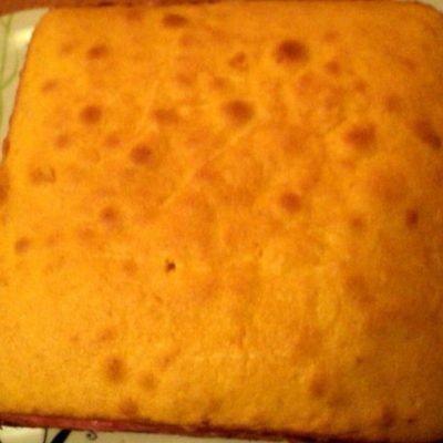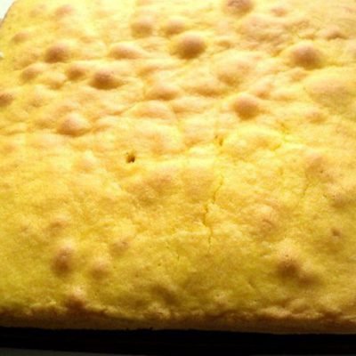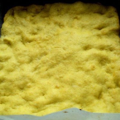 Prepare Dough No. 2Beat 3 ½ oz (100 g) of soft butter with 3 ½ oz (100 g) of powdered sugar. Continuing to beat, add 4 yolks, one at a time. Then gradually add 3 ½ oz (100 g) of flour, 1 teaspoon baking powder, and ⅓ oz (10 g) of vanilla sugar. Line a baking mold with parchment, grease it with butter, and place the dough in it. Bake the sponge cake for 35 minutes at 360 °F. Remove from the oven and let cool. |
