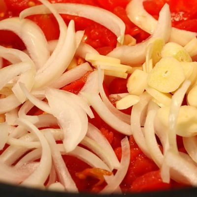Cut ½ of a yellow onion and garlic cloves into slices. |