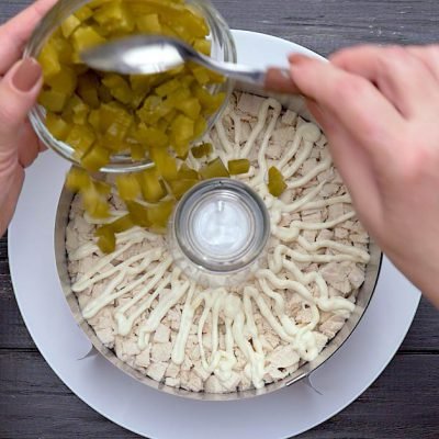 If desired, you can replace boiled chicken breast with a smoked one, and use cured cucumbers instead of pickled ones. It’d make taste more piquant. To make the salad ring-shaped, place a glass in the center of the dish. Layer the ingredients around it.