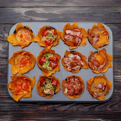 Pour a mixture of two beaten eggs into the bottom of three nests, then add a bit of diced bell pepper. At the bottom of the other three nests, place chopped broccoli and tomato halves, sprinkle with grated cheese. Place diced pepper, onion and bacon in the next three nests. Break 3 eggs into the rest of the nests, sprinkle with bacon. Season all the nests with some salt and pepper, bake for 20–25 minutes at 300 °F (150 °C). |